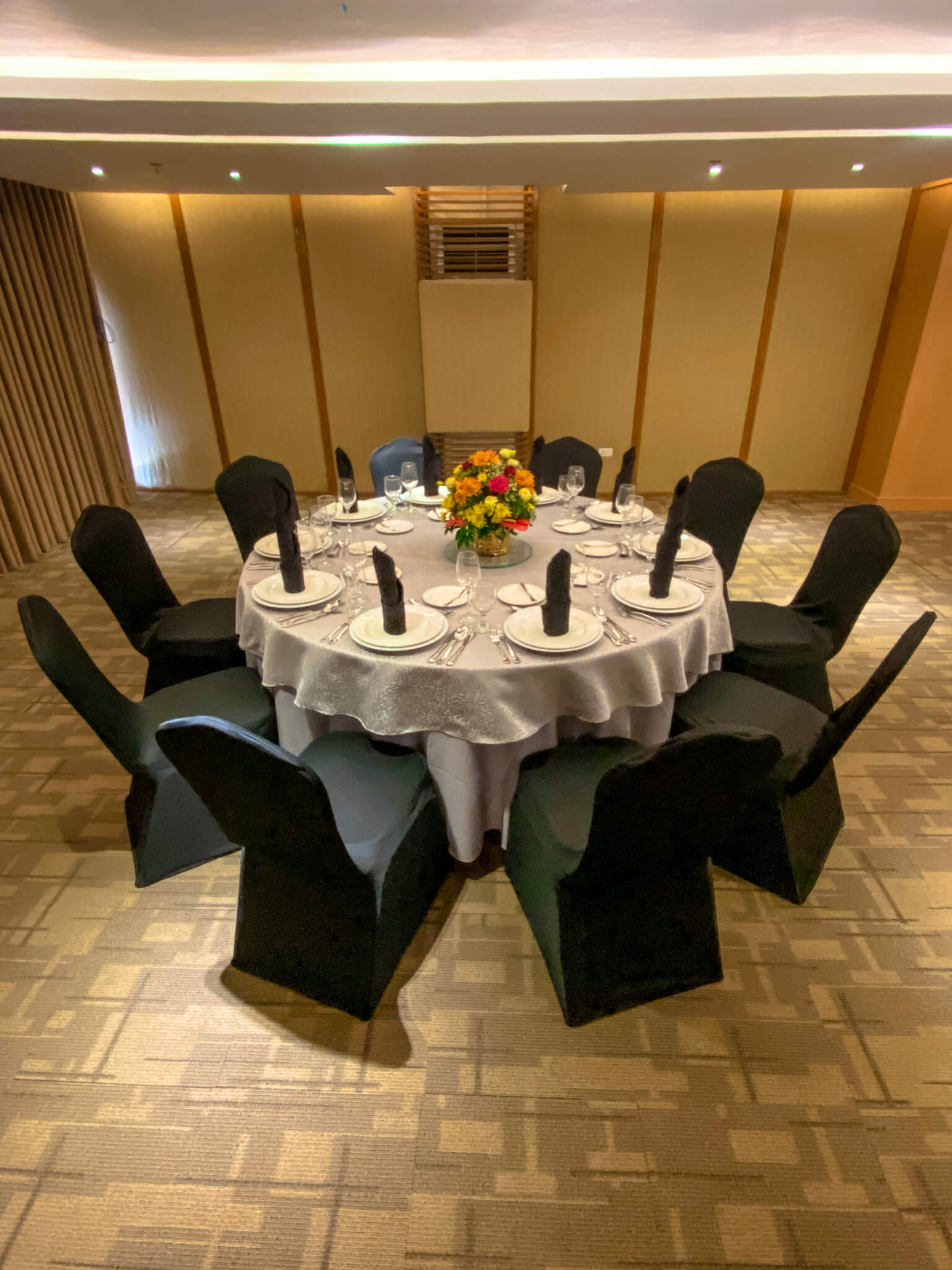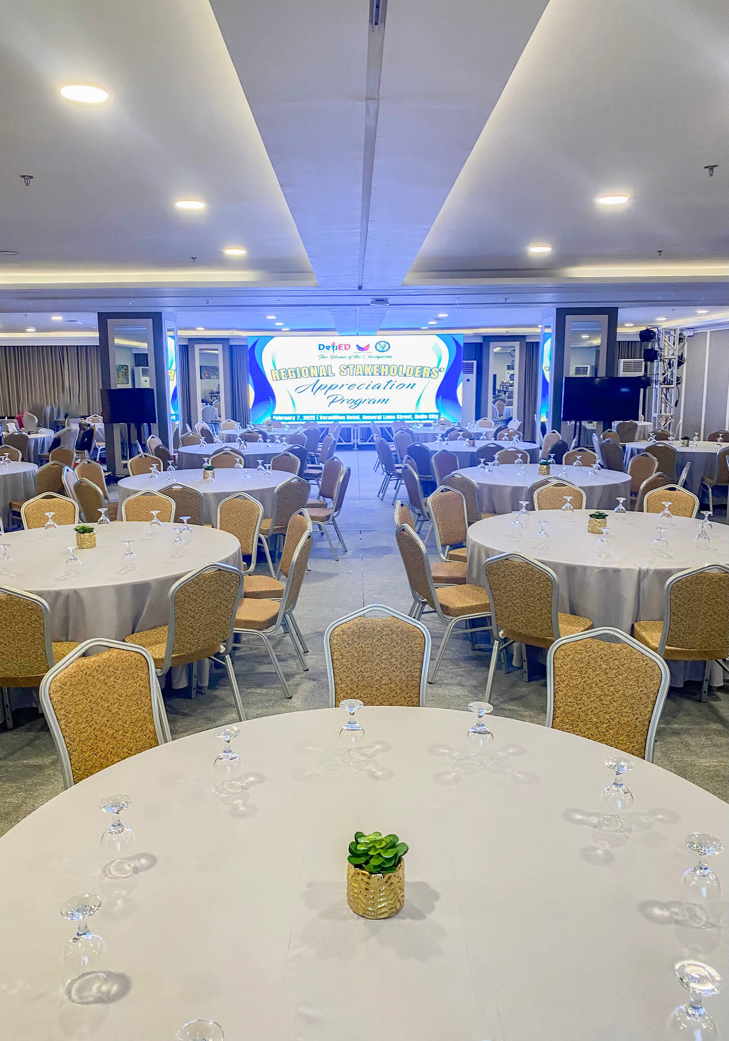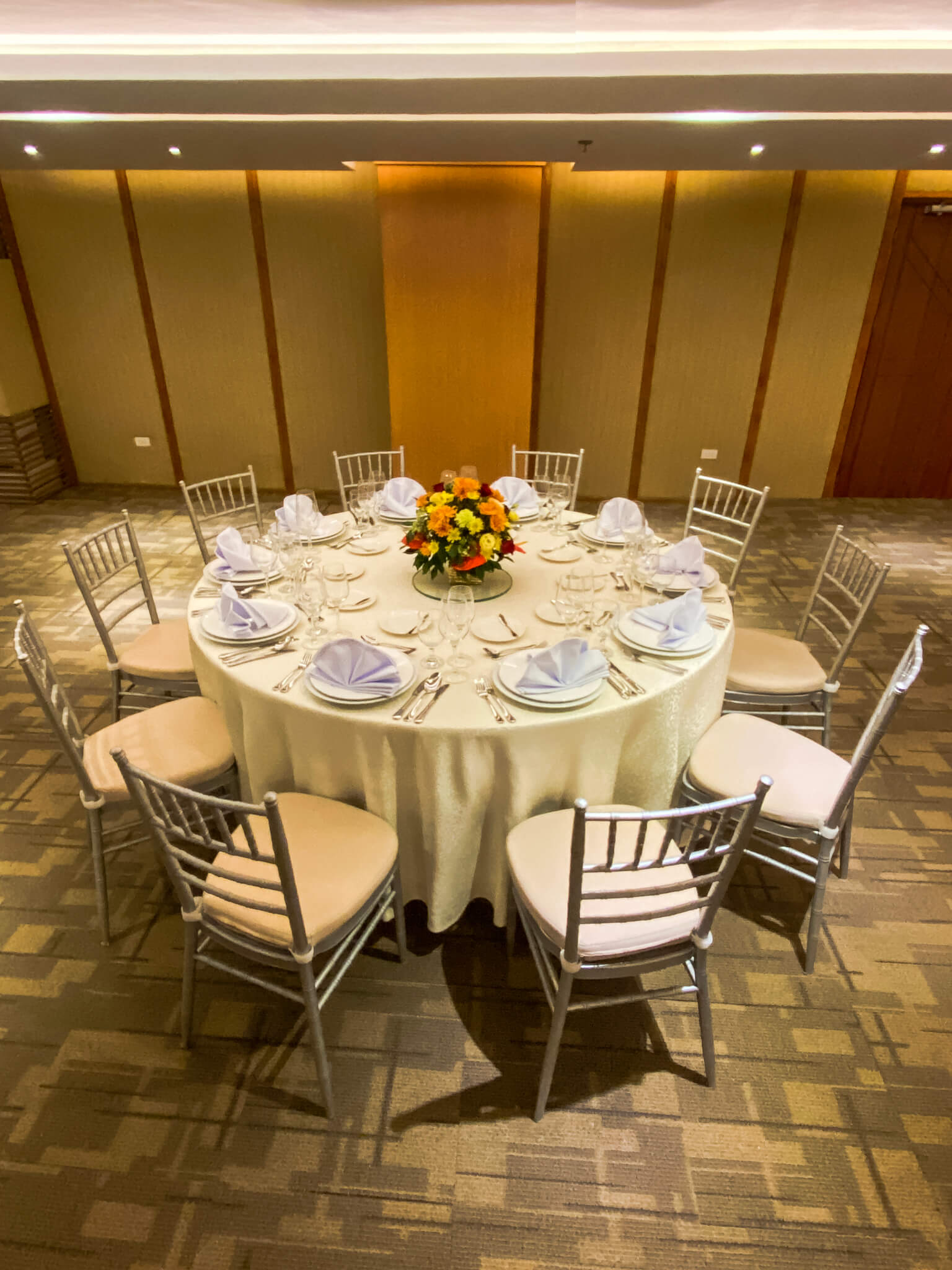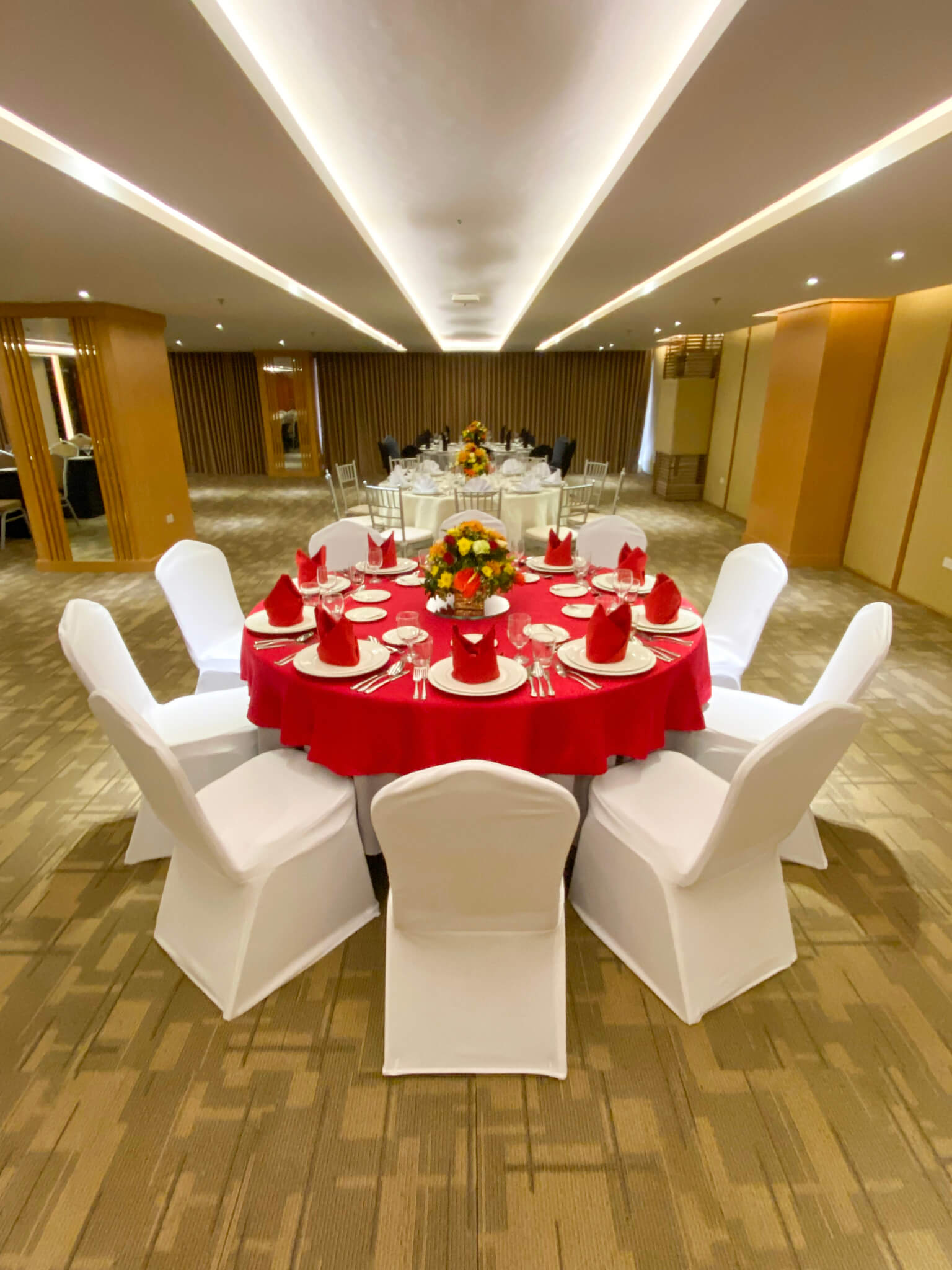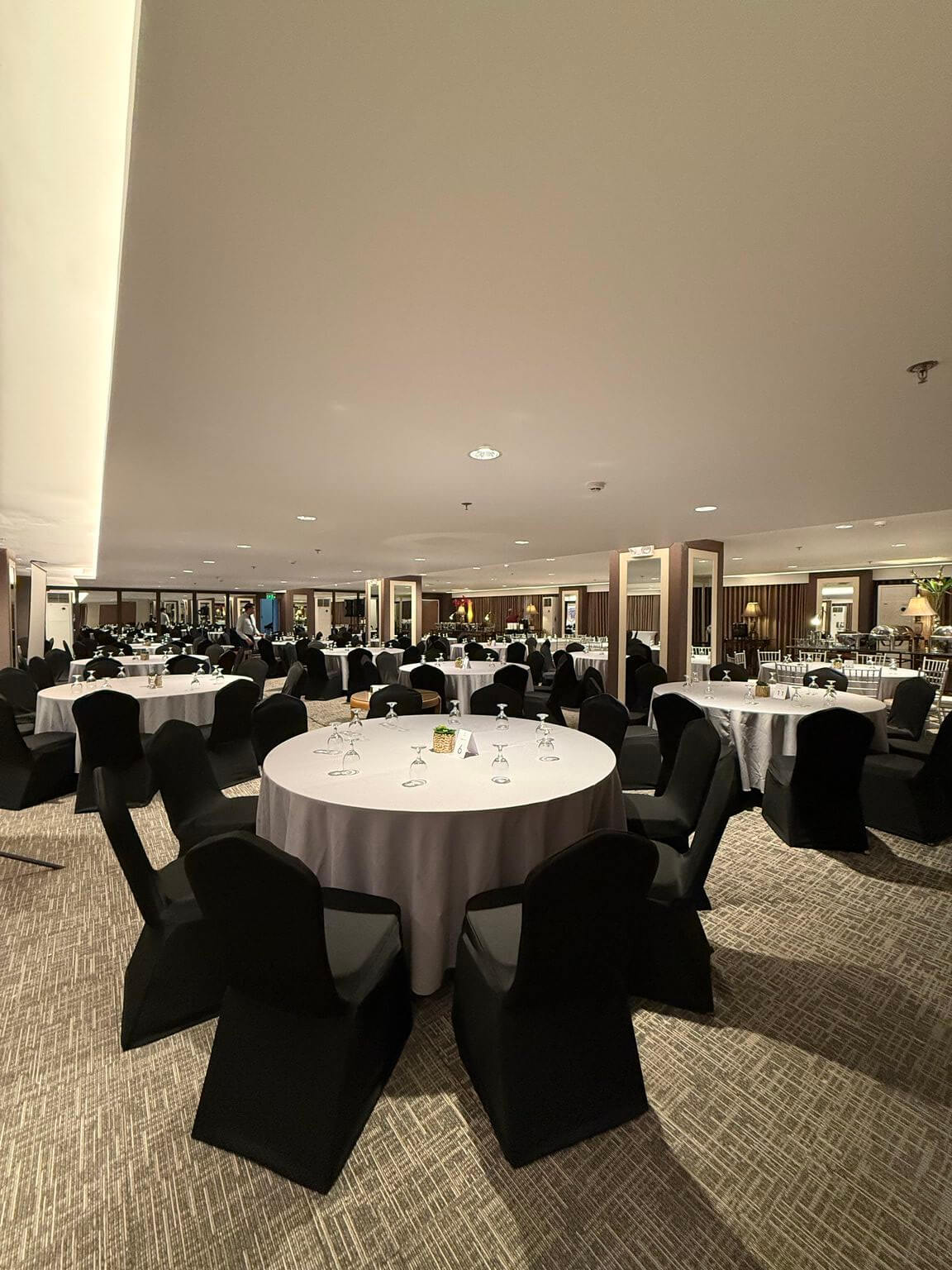 Ideal for formal dining events, wedding receptions, and gala dinners, the Banquet setup features elegantly arranged round tables