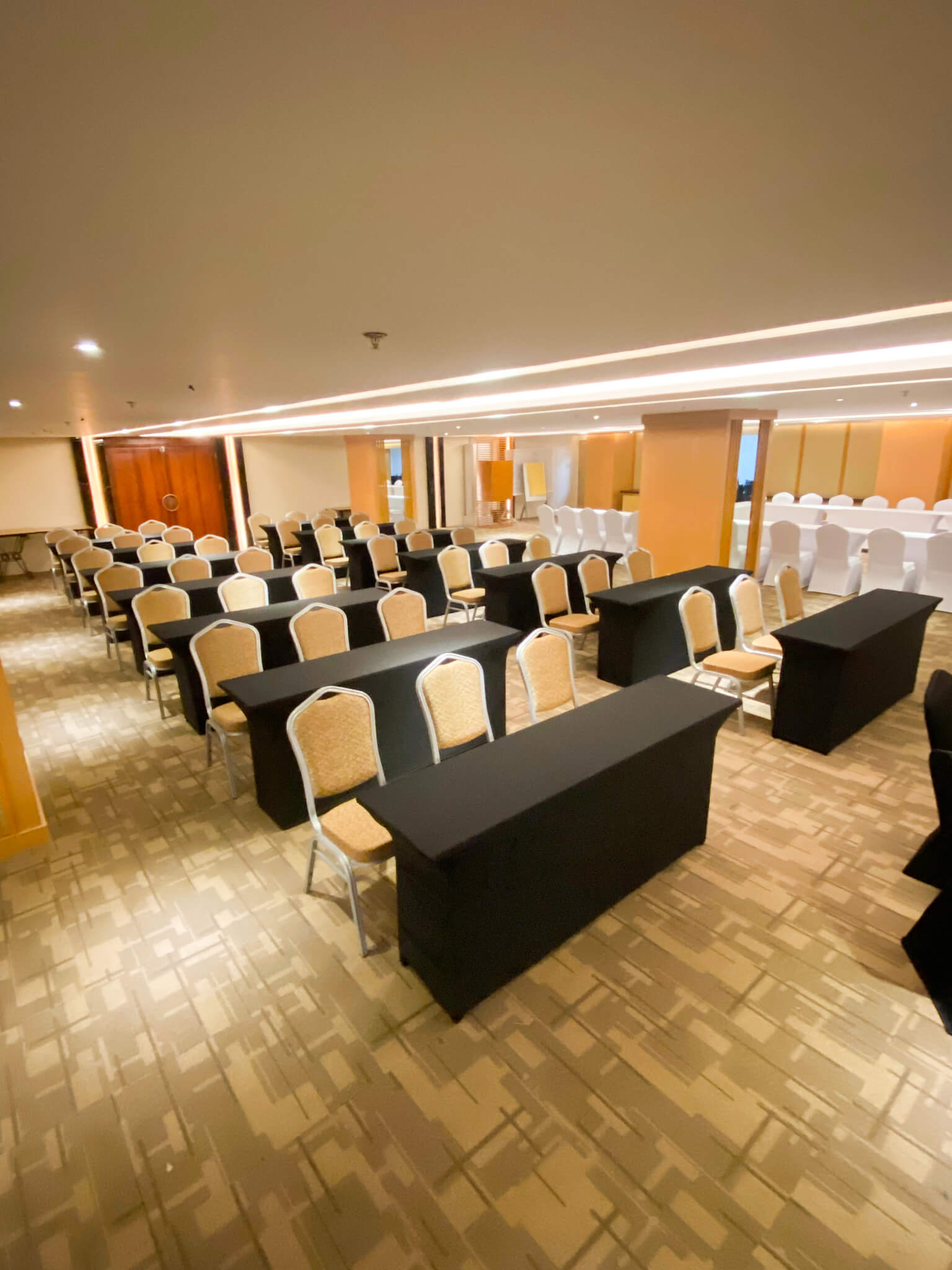 Perfect for training sessions or workshops, with tables and chairs arranged in rows, providing space for note-taking